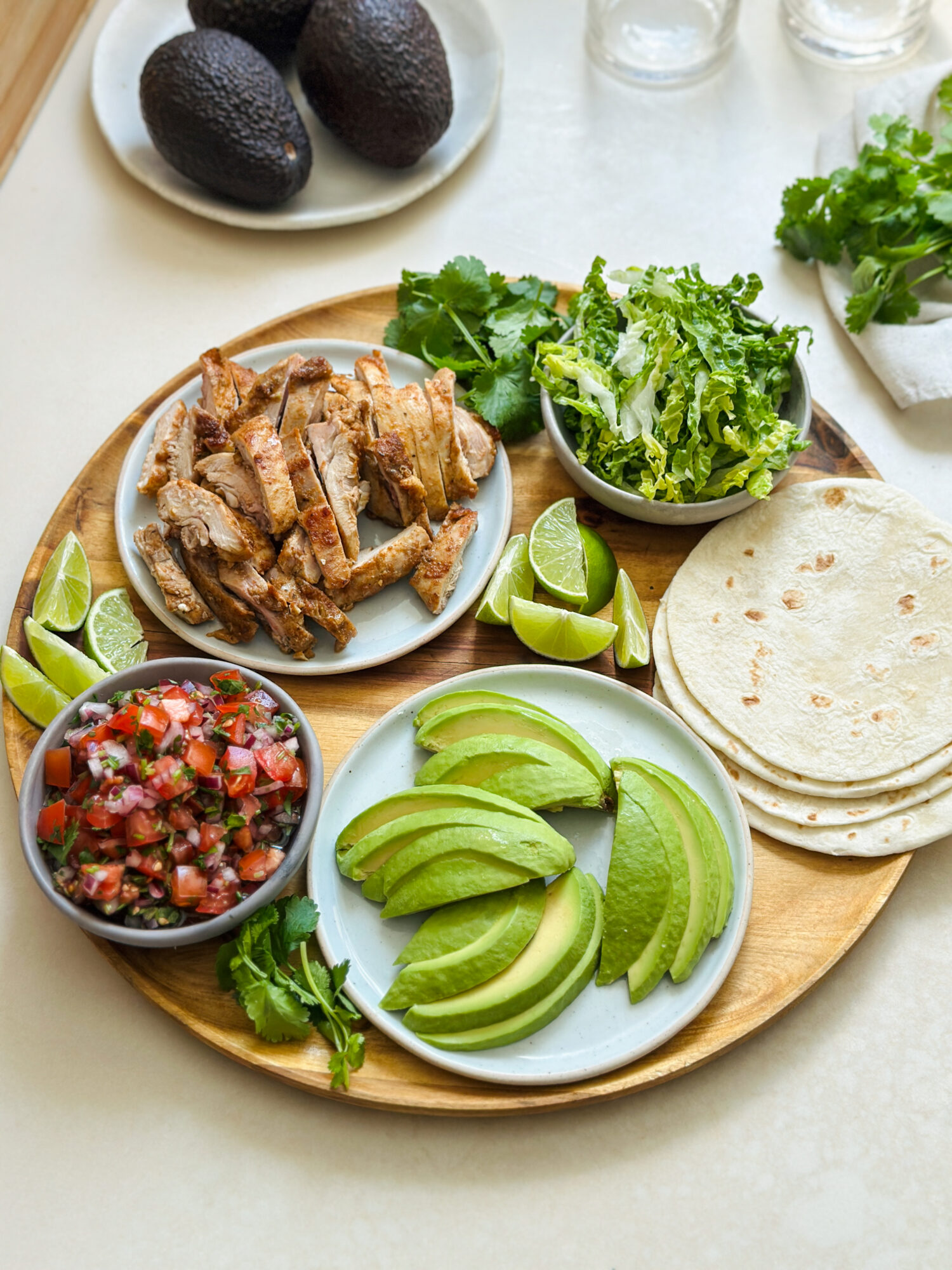 To make the tacos, place some lettuce into a warmed tortilla, top with some chicken, salsa and sliced avocado squeeze over lime juice to serve.