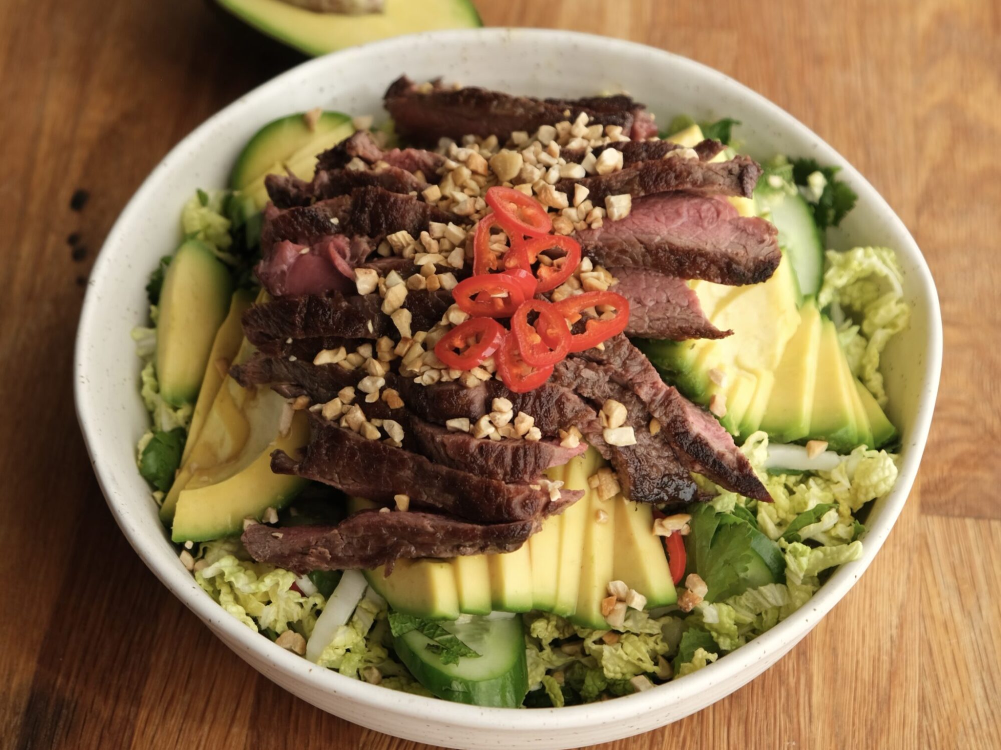Arrange the sliced beef and avocado over the salad, top with the peanuts then drizzle with the remaining dressing.